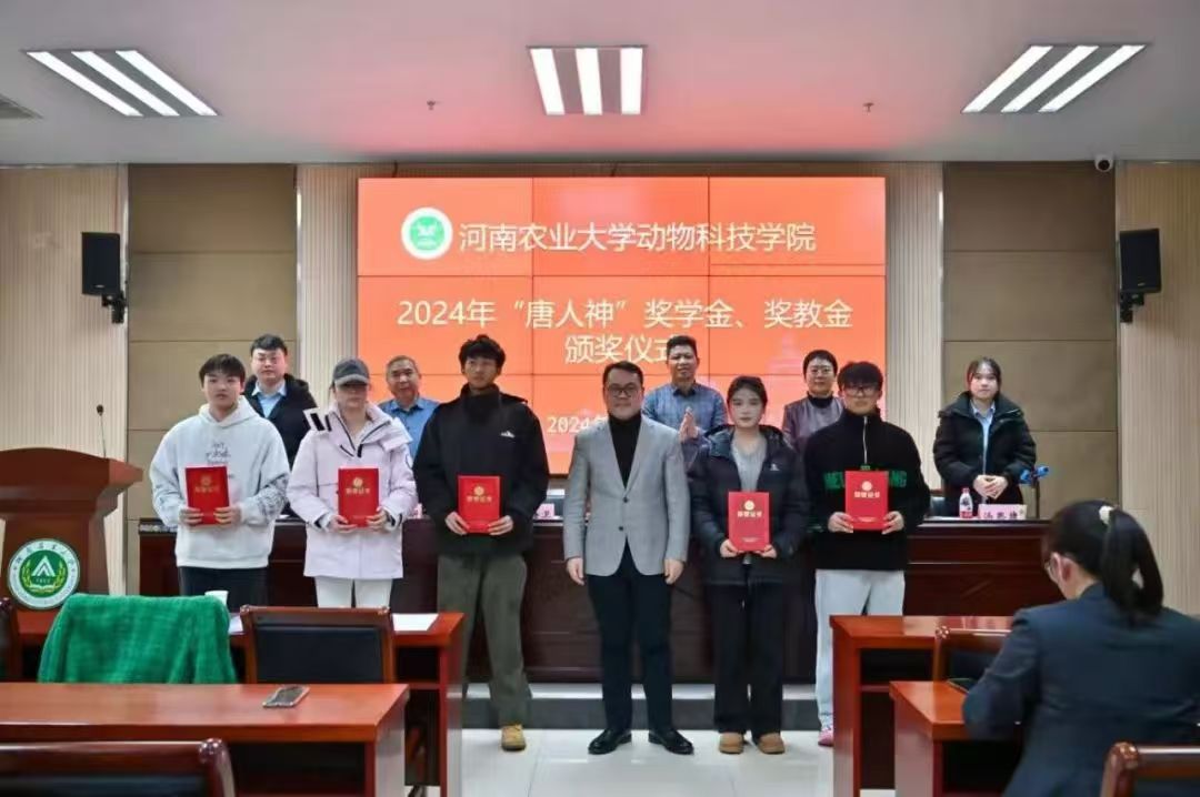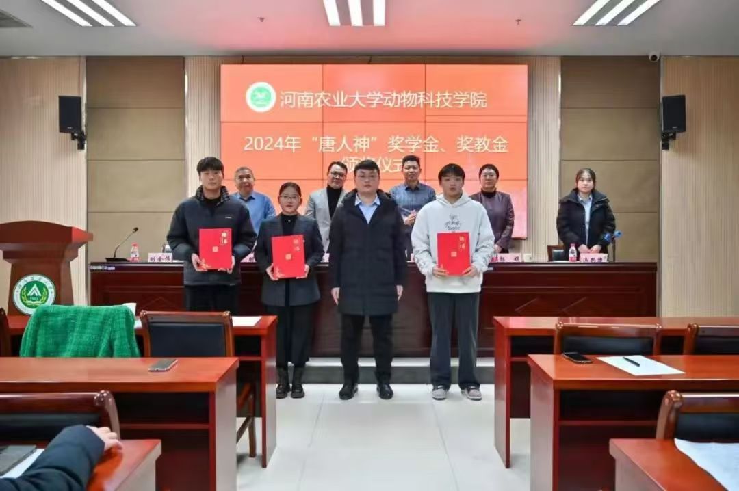 于龙子湖校区繁塔楼A324会议室举行2024年“唐人神”奖学金、奖教金颁奖暨第二届“唐人神班”开班仪式。唐人神集团(大学)执行校长赵海卫、唐人神集团人力资源中心招聘经理刘金伟和招聘主管汤思捷,校友办公室主任胡明忠、脱裤吧