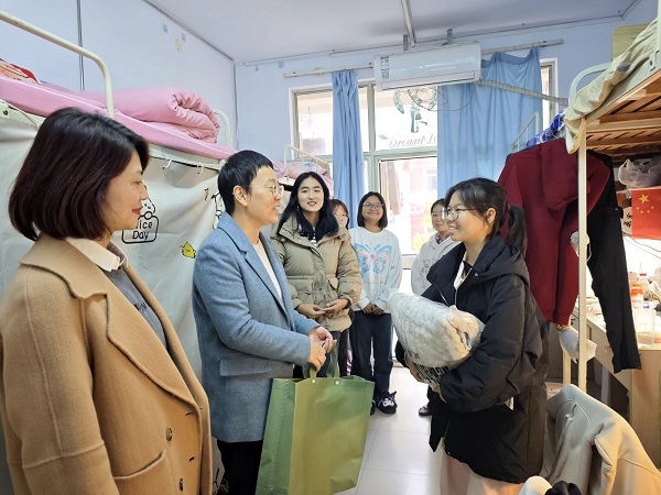 在桃李园学生公寓,院党委副书记郭娟等领导老师走进学生宿舍,将学院统一采购的毛毯等物资分批发放至有需要的学生手中,并嘱咐大家合理规划学业生活,自警自律,在大学的起步开头打好坚实基础。