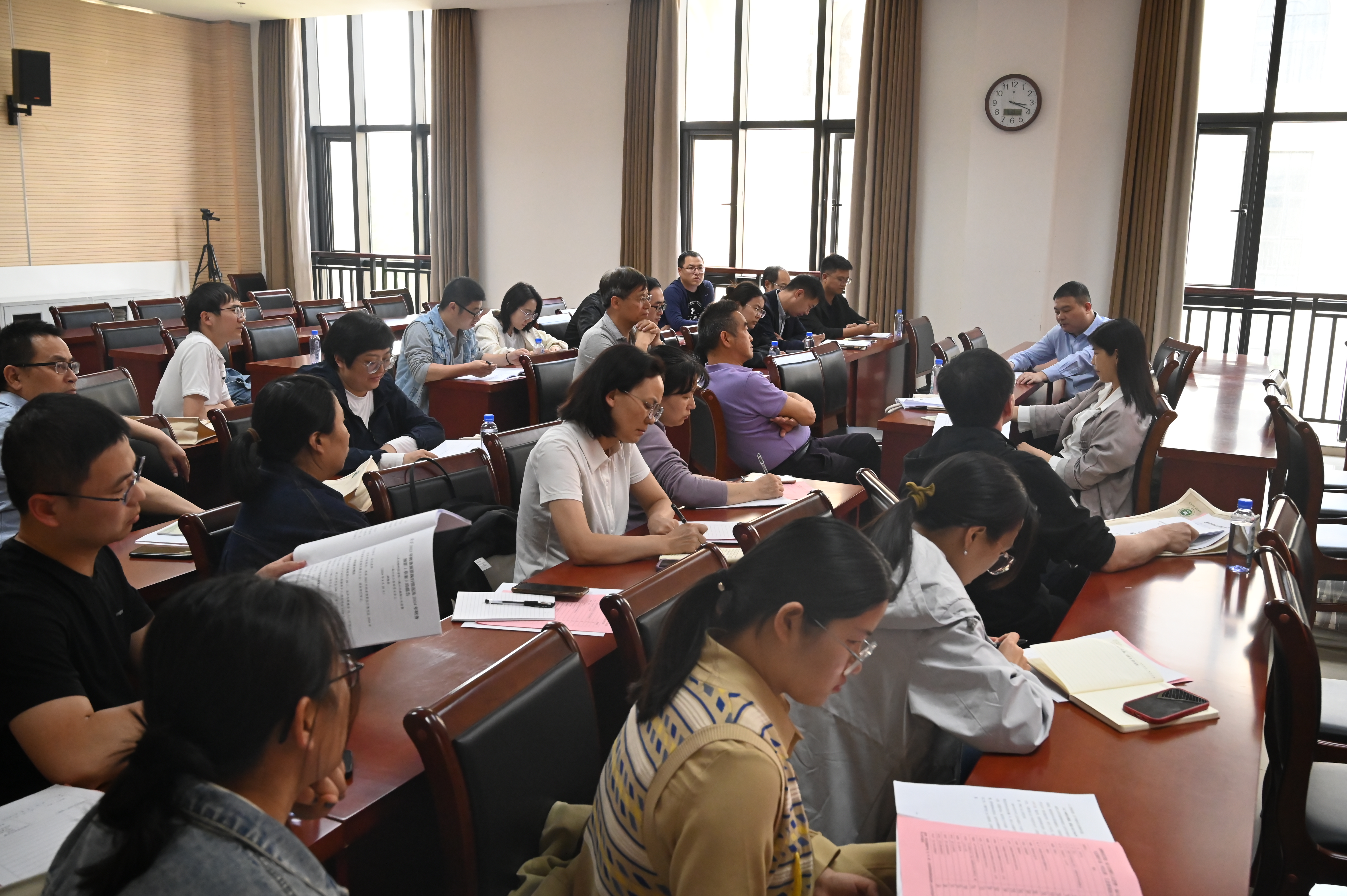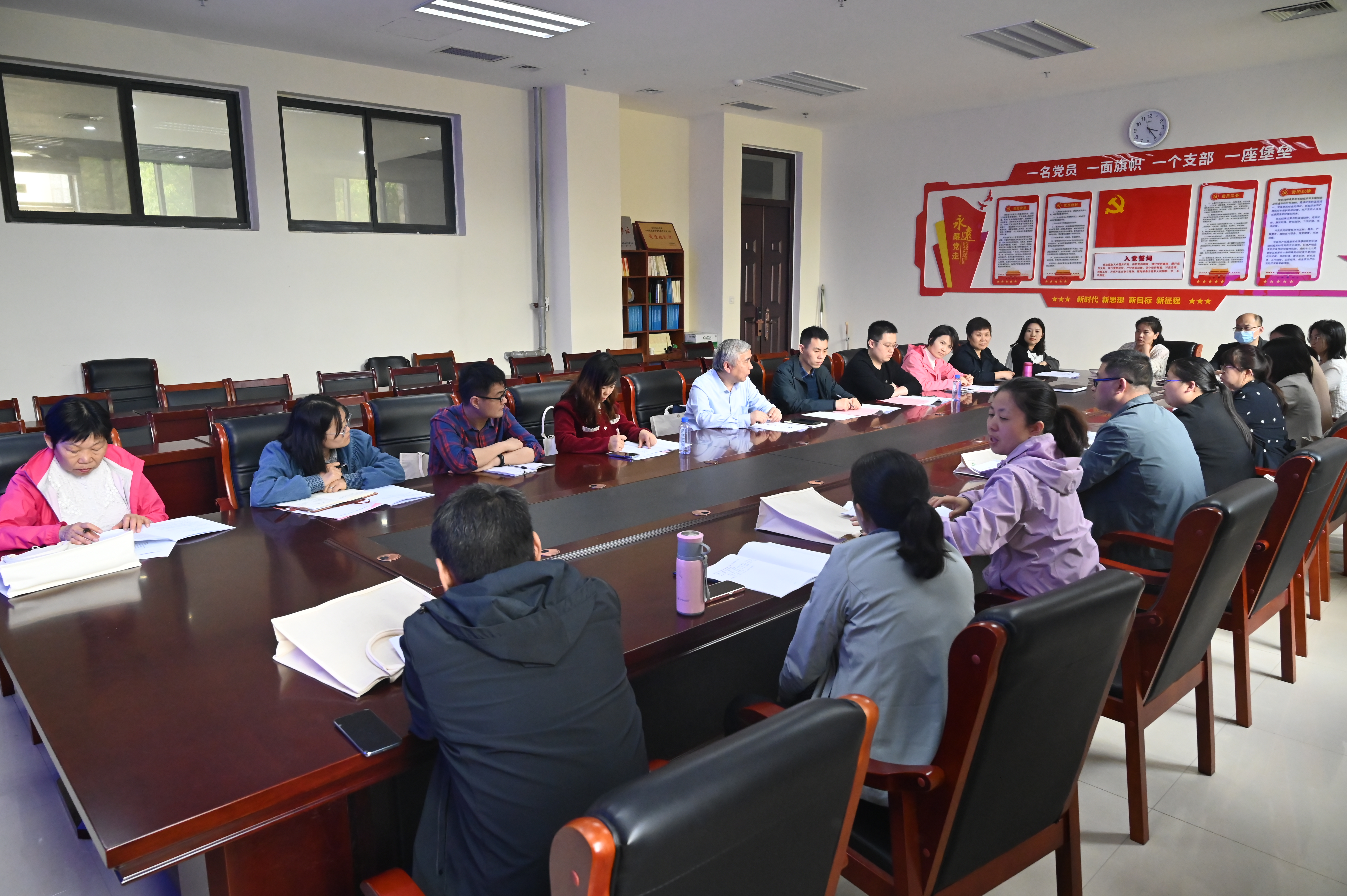 于龙子湖校区繁塔楼A324会议室召开一届六次教职工大会暨一届六次工会会员大会,院领导班子、全体教职工和特邀代表王成章教授参加会议。会议由院党委副书记、分工会主席郭娟主持。
