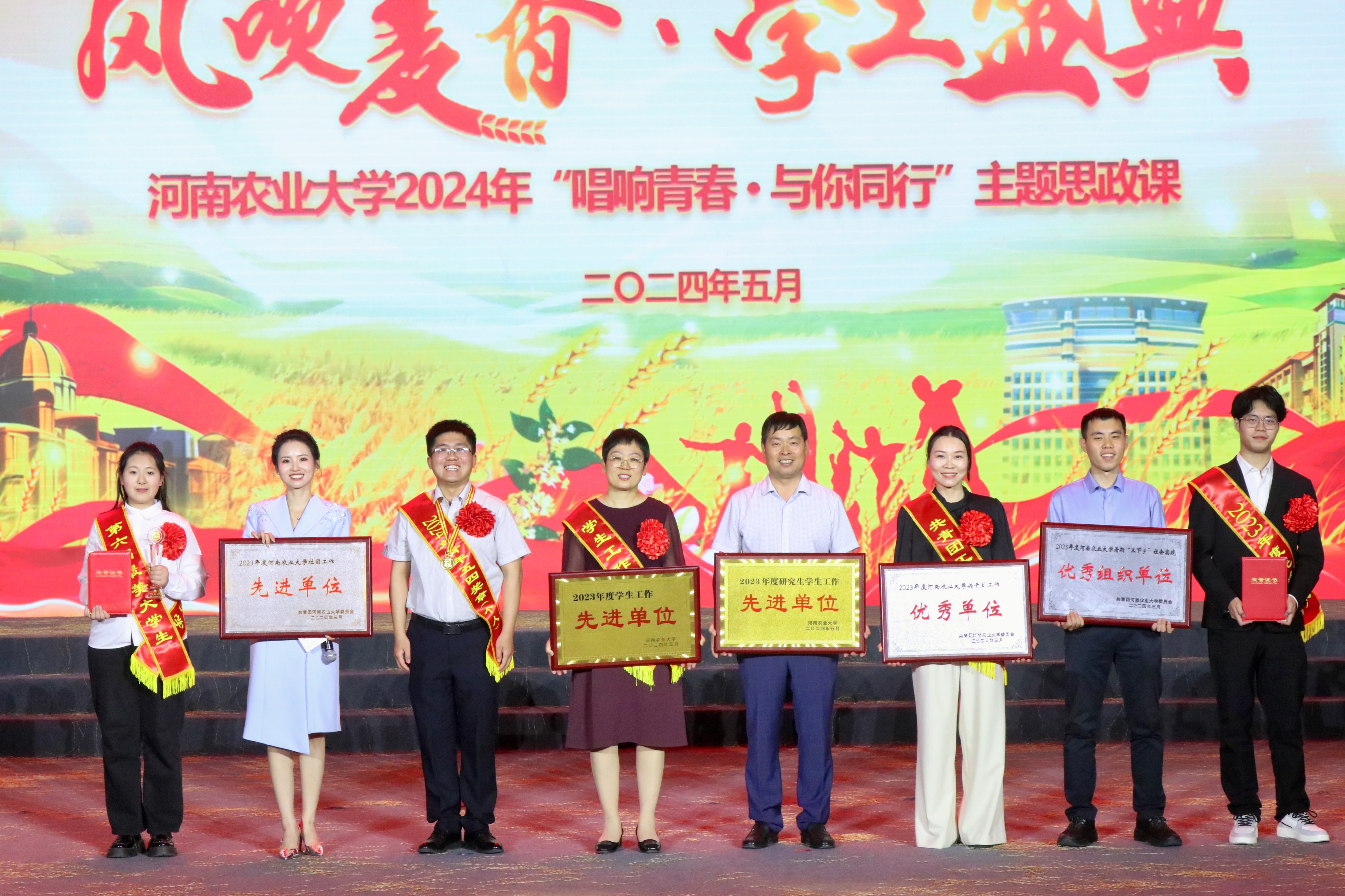 载誉而归。其中,学院喜获“学生工作先进单位”、“研究生工作先进单位”、“共青团工作优秀单位”、“资助工作先进单位”、“社会实践工作先进单位”、“社团工作先进单位”等6项集体荣誉,青年教师李转见获校“青年五四奖章”荣誉,2020级畜工专业学生霍姝琪获校“最美大学生”荣誉,这也是学院首位获此殊荣的学生典型;2021级学生曹世晴等4人获省级“三好学生”荣誉,王文桂获省级“优秀学生干部”荣誉,2021级动科三班获省级“先进班集体”荣誉。学院党委副书记郭娟、付院长孙宇、组织员兼团委书记韩笑及获奖师生代表上台接受表彰。