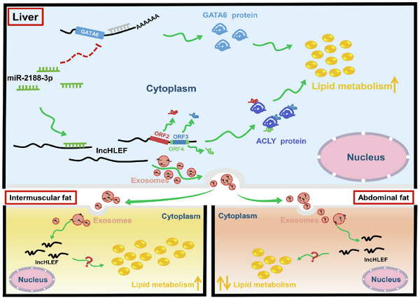 肝脏是鸡脂质代谢的主要器官,但有关鸡肝脏脂质代谢的调控机制,特别是长链非编码RNA(lncRNA)在这一过程中的作用机制依然不清。为此,课题组通过对产蛋前期和高峰期母鸡肝脏全长转录组分析,系统研究了鸡肝脏lncRNA与脂质代谢的关系,并鉴定出一个可促进肝细胞脂滴形成、甘油三酯和总胆固醇合成的基因间lncRNA lncHLEF。体外试验分析表明,lncHLEF不仅可以作为竞争性的内源性RNA调节miR-2188-3p/GATA6轴,还可编码3个功能小肽直接增强ACLY蛋白的稳定性,进而促进脂质合成。腺相关病毒介导的肝特异性lncHLEF过表达活体试验表明,lncHLEF可促进肝脏脂质合成,同时通过外泌体形式转运lncHLEF,从而促进肌内脂肪(IMF)沉积,但不改变腹部脂肪(AbF)沉积(图1)。该成果 “LncHLEF promotes hepatic lipid synthesis through the miR-2188-3p/GATA6 axis and encoding peptides, and enhances intramuscular fat deposition via exosomes” 以研究论文形式在线发表于国际著名期刊《International Journal of Biological Macromolecules》(中科院一区)。脱裤吧