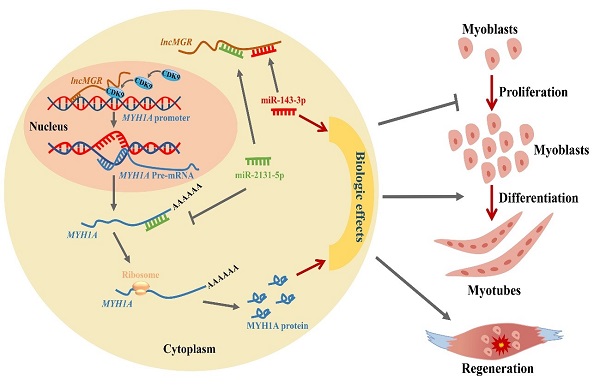 MYH1A的mRNA和蛋白表达,从而促进成肌细胞分化。另一方面,lncMGR通过同时吸收miR-2131-5p和miR-143-3p来抑制成肌细胞增殖,并调节它们对成肌细胞生长的拮抗作用。