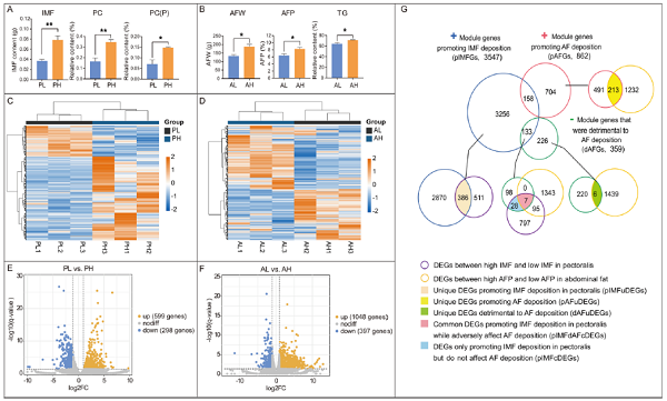 在鸡肉生产中,肌肉内脂肪(IMF)沉积有利于肉质的提升,而腹部脂肪(AbF)沉积却导致饲料浪费和环境污染。然而,IMF和AbF之间脂质组成的异质性和差异性沉积机制仍不清楚。课题组首先利用非靶向脂质组学技术,对地方鸡固始鸡胸肌IMF和AbF的组成成分进行了分析,共检测到423个鸡IMF和AbF之间的差异脂质分子(DLM),并确定了28种导致IMF和AbF异质沉积的主要DLM,通过加权基因共表达网络分析(WGCNA)将转录组与主要DLM进一步整合分析,发现了5个关键基因集,包括386个促进胸肌IMF沉积的特异性基因、213个促进AbF沉积的特异性基因、6个对AbF沉积不利的基因、7个促进胸肌肉IMF沉积但对AbF沉积有不利影响的基因以及28个仅促进胸肌IMF沉积但对AbF沉积没有影响的基因。这些发现为理解IMF和AbF差异性异沉积提供了新视角,并为通过育种选择提高肉质提供宝贵的信息资源(图4)。该成果 “Integrated LC/MS-based lipidomics and transcriptomics analyses revealed lipid composition heterogeneity between pectoralis intramuscular fat and abdominal fat and its regulatory mechanism in chicken” 以研究论文形式在线发表于国际著名期刊《Food Research International》(中科院一区)。脱裤吧