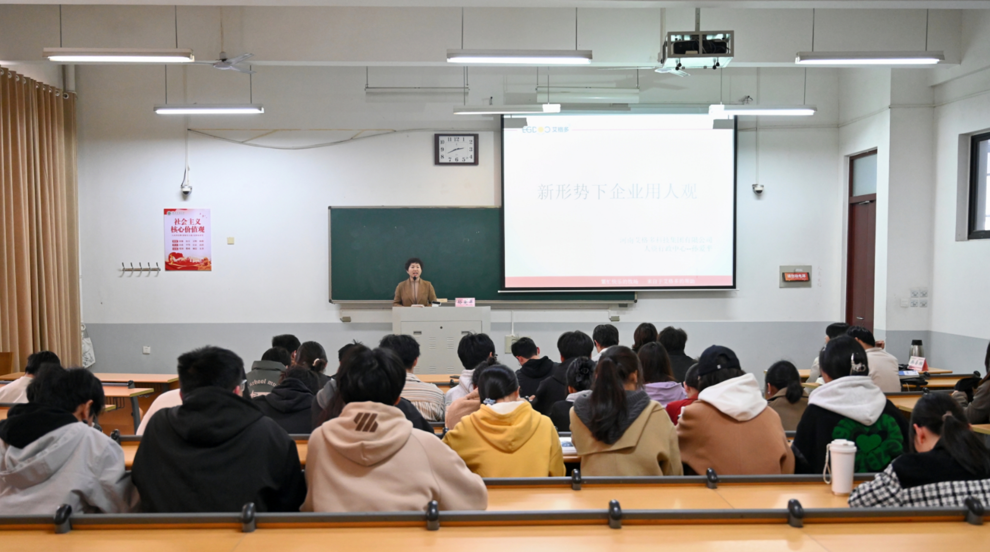 孙爱平通过企业宣传视频为大家介绍了艾格多集团概况,随后从“行业发生了什么”、“企业用人观发生什么变化”、“我们该做好哪些准备”三个方面,为同学们分析总结企业倾向的人才类型,同时引入“职业锚”概念,结合思维导图讲授做好职业规划的重要性与方法。她详细讲解了企业独特的“百人练兵计划”,并分享了校友加盟艾格多集团的感悟视频,表示欢迎大家前往艾格多集团实习、参观与就业。