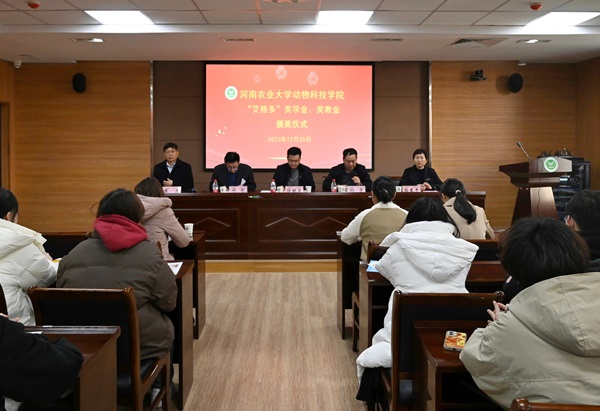 于龙子湖校区第一实验楼南321会议室举行2023年“艾格多”奖学金、奖教金颁奖仪式。河南艾格多科技集团总裁任振东与人资行政总监孙爱平、脱裤吧