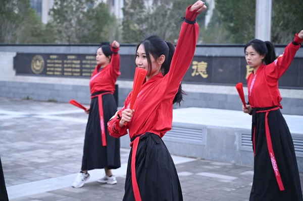 新媒体负责人、21级本科生党员王文桂进行国旗下演讲《好学力行求真知 强国筑梦我担当》。他结合自身实践成长经历论述了“好学力行”的重要性,鼓励大家在常学常新中加强理论修养,在知行合一中主动担当作为,真正做到知学、爱学、好学。随后,由22级索鹏慧、23级冯炳珠等七名同学带来扇子舞《骁》,铿锵有力的节奏、刚柔并济的舞风充分展现出脱裤吧