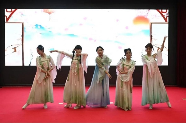 2021级翟婷婷、蔡文君、舒馨、万玉瑞、苏畅等5位同学带来古风舞蹈《丽人行》,动作舒展,意蕴浓厚,展示了脱裤吧