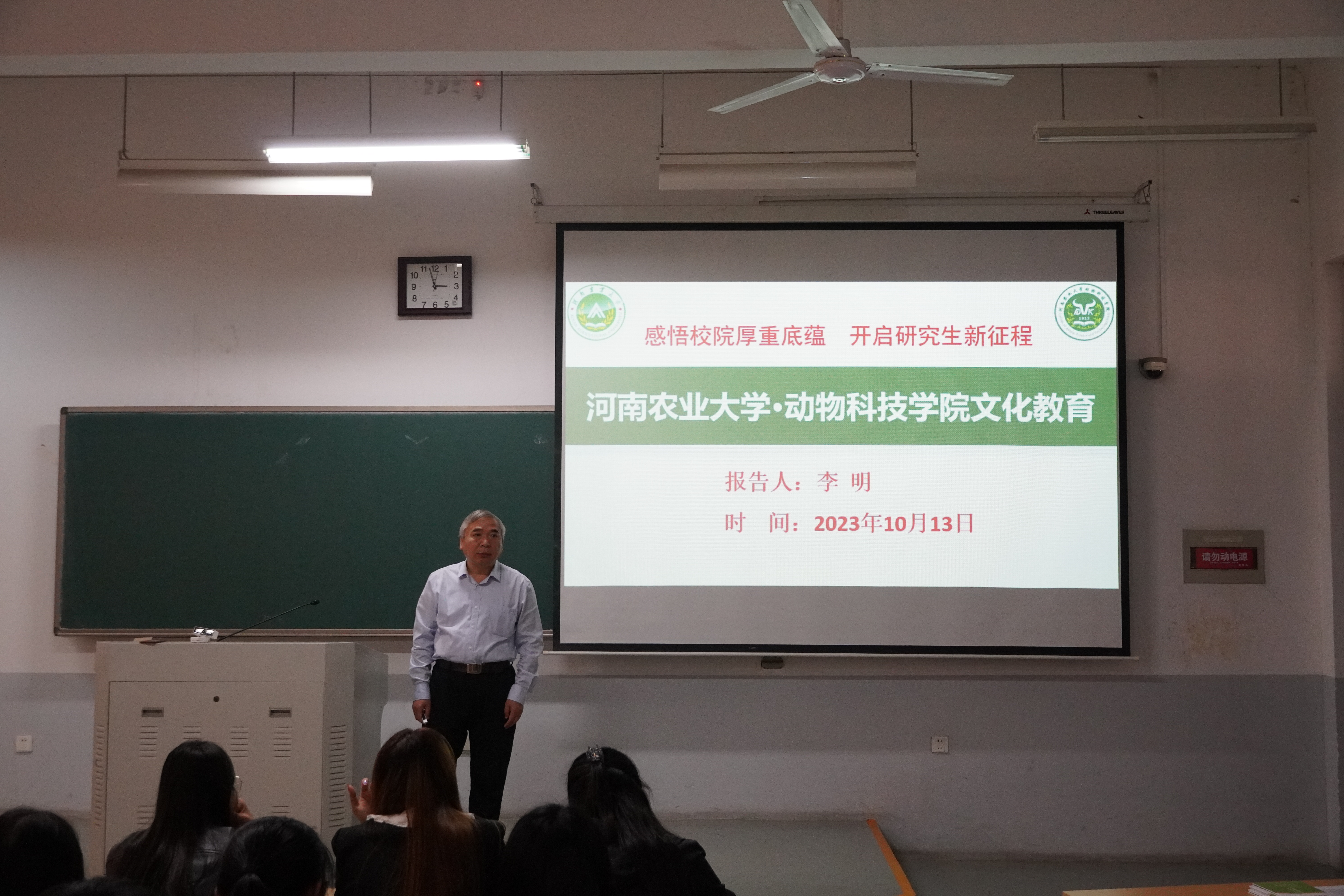 李明以“感悟校院厚重底蕴,开启研究生新征程”为题,从脱裤吧 120余年的发展简史及办学历程、学院发展简介、学院基本情况、学院文化等方面进行讲解。号召同学们秉承“刚健笃实,辉光日新”的院训,弘扬“团结奋进,力争上游,遵从集体,爱我动科”的学院精神,以更加饱满的热情与更加积极的心态投入到未来的学习和研究中。