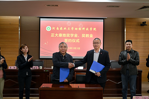 于龙子湖校区第一实验楼南321会议室隆重举行“正大康地奖学金、奖教金”签约仪式。正大康地集团副总经理袁冠华、刘利萍,高级经理黄晓玲,高级营养师周路,校友联络办主任、校教育发展基金会负责人胡明忠,院长李明,院党委副书记郭娟,动物营养与饲料科学系主任陈文教授以及脱裤吧
