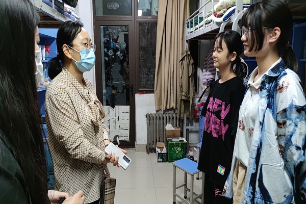 党委书记贾磊、副书记郭娟及团委辅导员黄璞一行深入宿舍,了解学生实际需求,及时排忧解难,引导大家坚定理想信念,保持客观冷静,提高防护意识,筑起防控屏障,并鼓励党员、学生干部要强化主人翁意识和大局意识,带头响应号召,引导身边同学正确理解、积极配合、科学参与疫情防控;