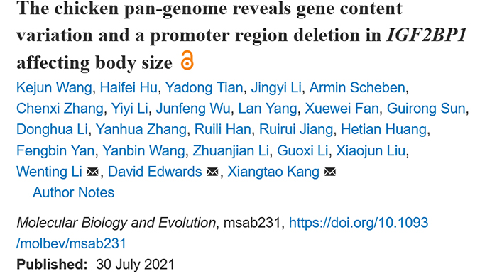 康相涛教授科研团队与澳大利亚西澳大学等单位合作,构建了首个鸡泛基因组,并解析了影响鸡生长性状主效基因IGF2BP1的致因突变。7月30日,该研究成果在国际著名期刊Molecular Biology and Evolution(IF=16.24),以Article形式在线发表。