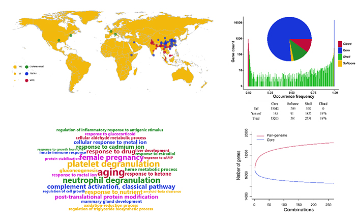家鸡是世界上最早驯化的动物之一。多项证据表明家鸡是由红原鸡的一个亚种驯化而来,但其它原鸡属(灰原鸡、绿原鸡和黑尾原鸡)也对家鸡存在基因渗入现象。因此,家鸡不仅仅从红原鸡进化而来,而是多个原鸡混合形成的品种。而现在家鸡的参考基因组仅从一只红原鸡测序组装而来,当前的参考基因组(GRCg6a)不能够覆盖所有家鸡的遗传变异。同时,近年来研究发现大量的表型变异是由基因组结构变异导致的,因此,构建鸡的泛基因组,不仅可以完善鸡基因组,而且可捕获更多的结构变异,用来解析表型变异的遗传基础。