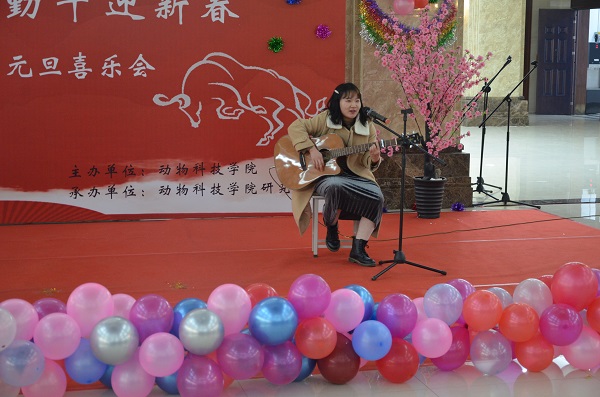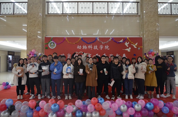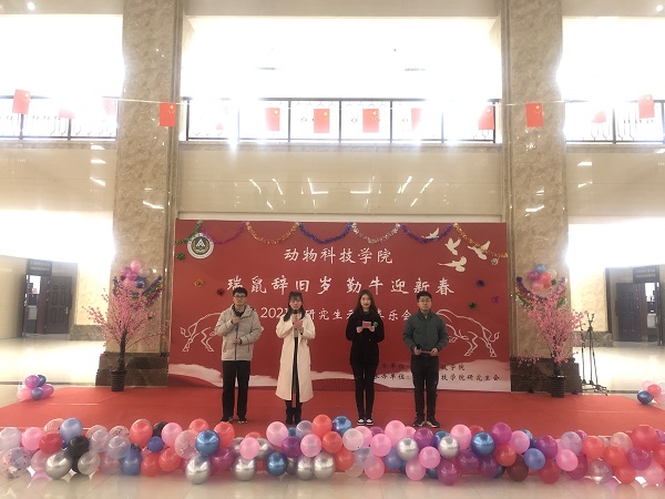 于龙子湖校区第一实验楼一楼大厅举办了“瑞鼠辞旧岁,勤牛迎新春”研究生元旦喜乐会。院党委副书记郭娟、副院长田亚东、部分导师和全体研究生欢聚一堂,喜迎元旦佳节。