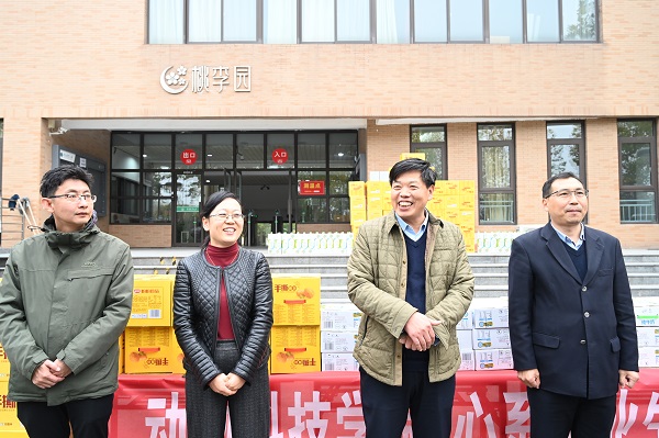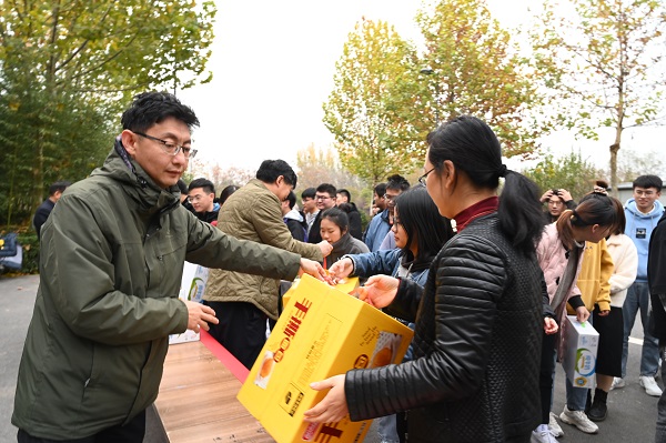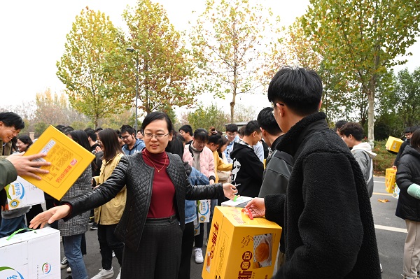 本网讯(通讯员 魏梦雅 )11月20日下午,桃李园学生公寓楼前气氛活跃、欢笑声不断,党委书记贾磊、党委副书记郭娟、副院长田亚东、副院长付彤及党委组织员来卓为2017级全体毕业生发放慰问品,每人一箱牛奶和一箱面包,来自冬日的第一份温暖让现场的毕业生同学连呼“暖爆了”!。