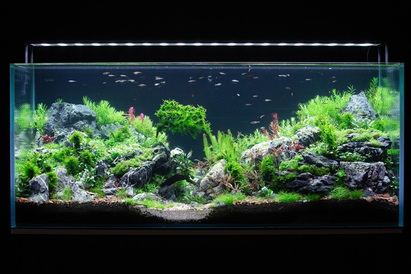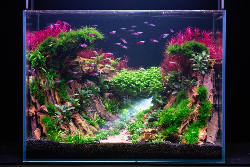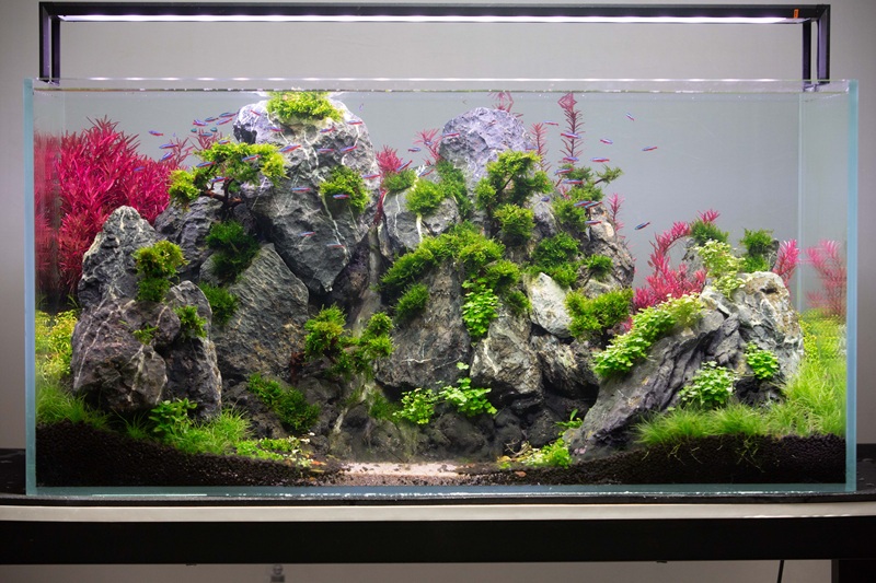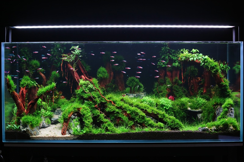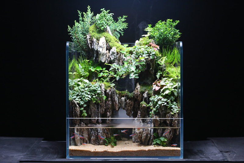 参赛选手依据前期设计方案,完成景观骨架搭建,以及各类水草的精心布局与栽植,将水族箱逐步构筑成富有生机的水下景观;第二赛段,脱裤吧
