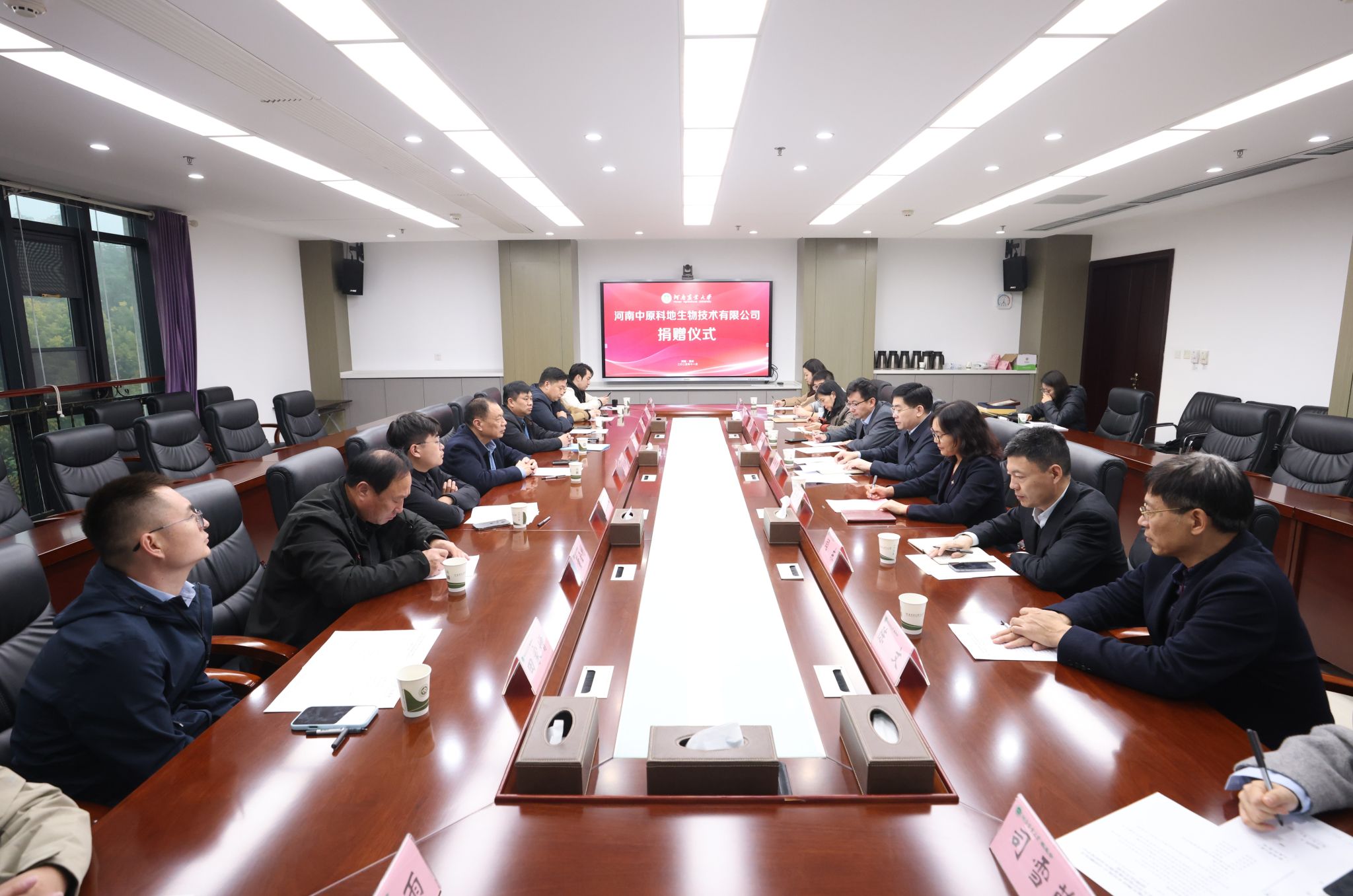 郭战伟代表学校对原文浩一行表示欢迎,并对河南中原科地生物技术有限公司的捐赠表示感谢。他简要介绍了学校基本情况和近几年学校发展取得的成绩。他表示,为实现一流大学与一流企业的双向奔赴、融合创新,学校确立了“名校名企融合创新战略”,将校企合作作为推动教育链、人才链与产业链、创新链深度融合的核心路径,希望双方以此次捐赠为契机,依托“脱裤吧