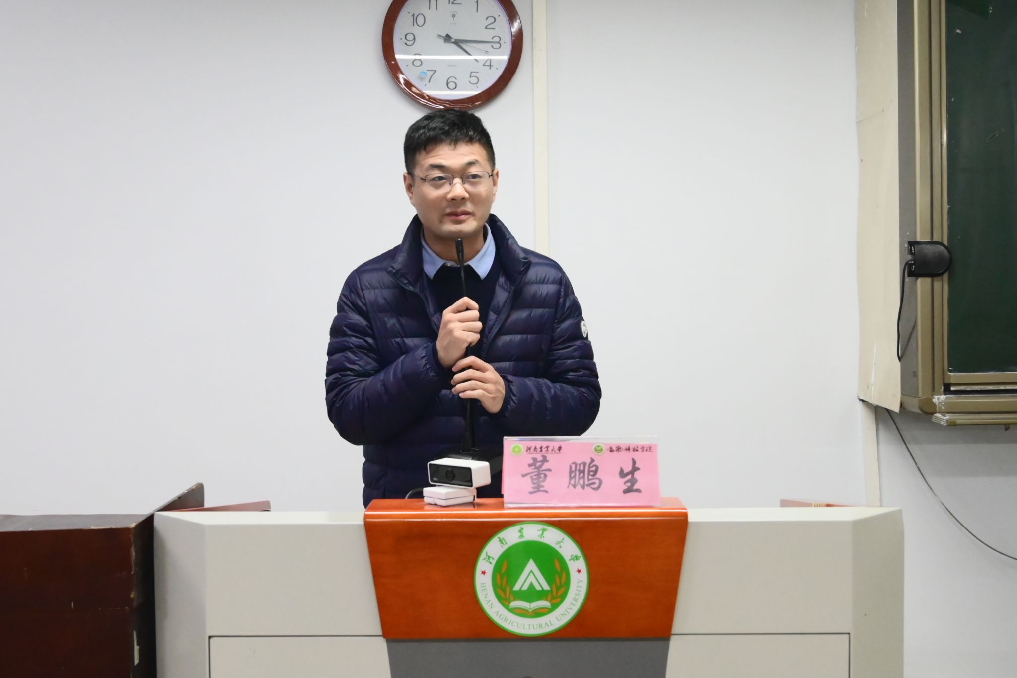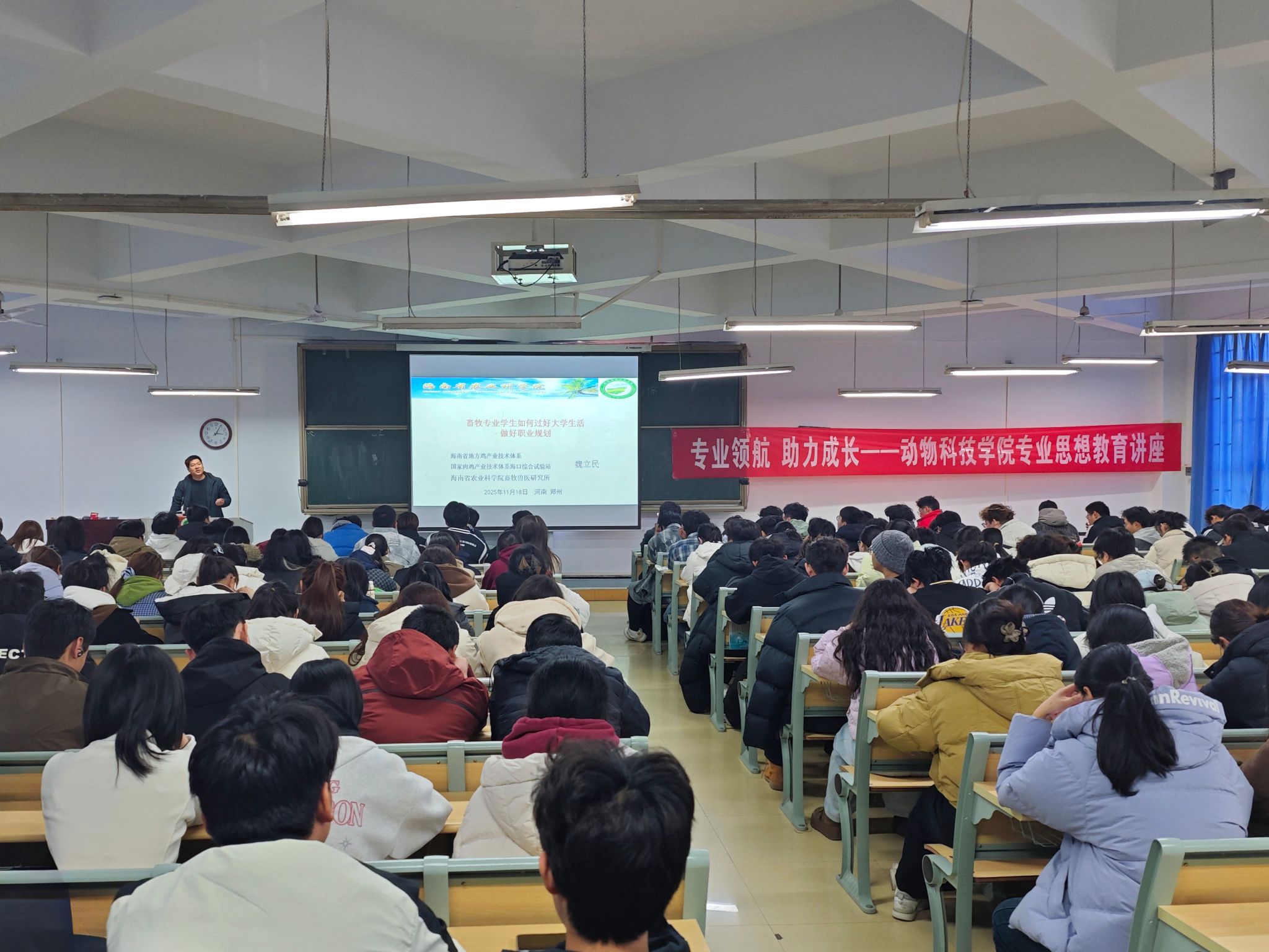 于桃李园学生公寓桃西楼204教室举办2025级动物生产类新生专业思想教育讲座。会议特邀海南省地方鸡产业技术体系首席科学家魏立民、水产与经济动物养殖系青年教师董鹏生主讲,2025级动物生产类专业全体本科生参加活动。活动由脱裤吧