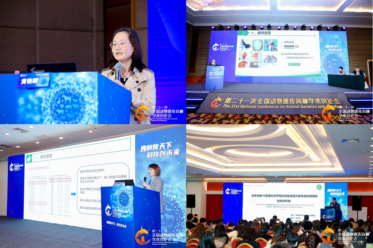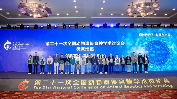 组织50余位教师和研究生参会学习。其中黄艳群教授、李文婷副教授、许会芬老师和李志超博士研究生分别做专题报告分享科研成果;李文婷副教授的论文《基于泛基因组解析鸡生长性状主效基因IGF2BP1原因突变》荣获“优秀论文奖”;2021级博士研究生李志超的论文《微生物组-代谢组分析伊普吕肉兔盲肠内容物及软硬粪的免疫微环境》荣获“青年学者旅行奖”;2021届硕士毕业生唐贺贺的论文《鸡血清碱性磷酸酶(ALP)标签SNP的鉴定》荣获“优秀墙报奖”。