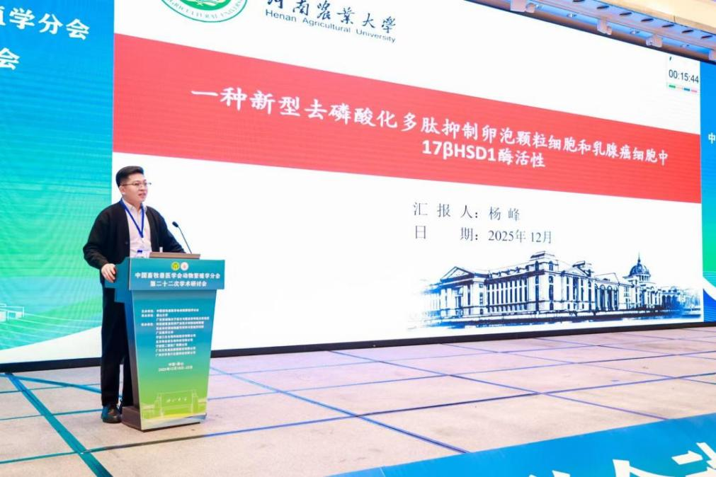 郑振宇教授、刘深贺副教授、杨峰副教授、余彤老师、李烛南老师带领多名研究生参会。会上,杨峰应邀在主会场作专题报告,题目为《一种新型去磷酸化多肽抑制卵泡颗粒细胞和乳腺癌细胞中 17HSD1 酶活性》。报告揭示了去磷酸化多肽在卵泡闭锁与乳腺癌中的调控机制,提出基于磷酸化位点的潜在治疗策略,为乳腺癌治疗研究提供了新思路。