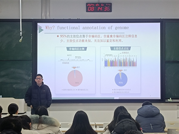 潘章源研究员的授课报告深入浅出,独到的分子生物知识令研究生们获益匪浅。一开始潘研究员以组织层面为出发点,陈述了不同的组织是由不用的调控元件结合组蛋白转录翻译而成,强调了内含子的重要性以及包括启动子、激活子、增强子以及抑制子在内的各种调控元件的作用,并与疾病、性状结合在一起进行分析。最后展示了他的科研成果,比如构建完善了多个畜禽物种调控元件图谱、保守性功能靶点的跨物种应用等重大科研成果。报告结束后,在场的研究生们踊跃提问,互动频繁,激发了研究生的科研思路。