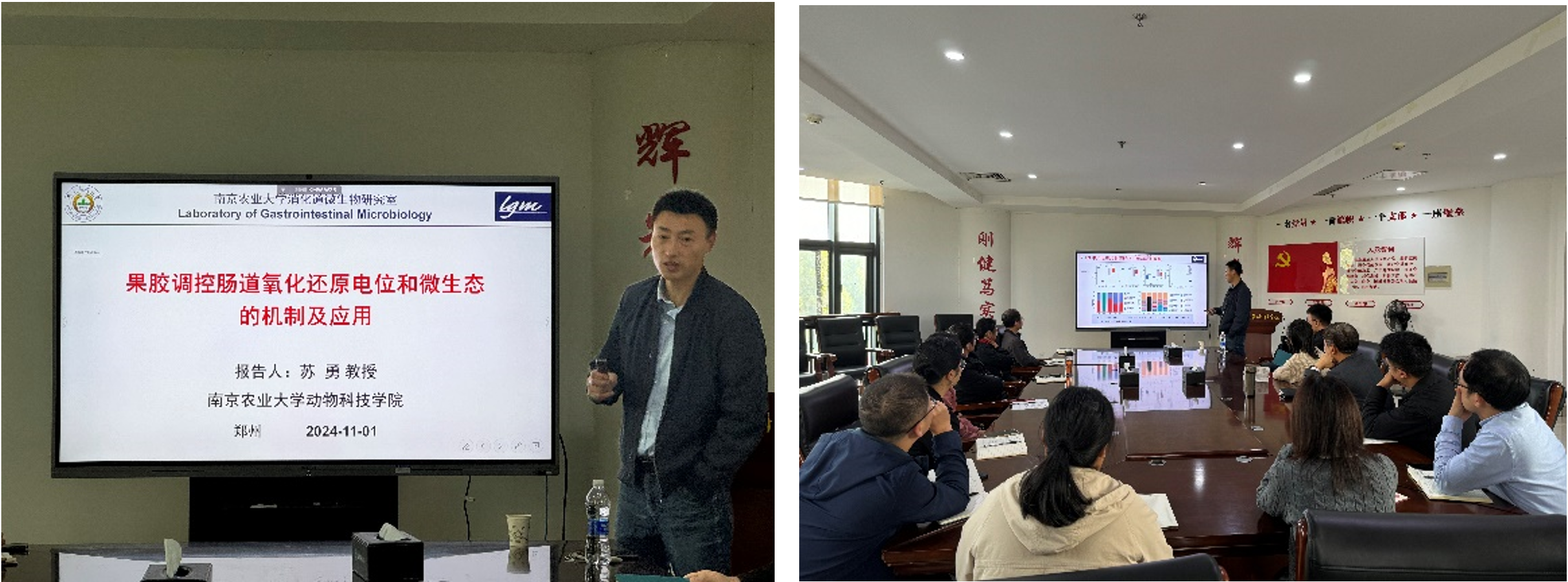 在本次学术交流中,苏勇教授以《果胶调控肠道氧化还原电位和微生态的机制及应用》为题,首先对其团队的研究方向和基本情况进行简要介绍。其次他围绕果胶对猪肠道内环境、微生态结构和功能的影响及其对肠道氧化还原电位和微生态的调控作用等内容进行详细讲解,并分享了他们团队在果胶调控大鼠肠道氧化还原电位的研究成果,进一步表明其团队未来的研究方向及目标,并对相关学术问题进行解答。最后,苏勇教授分享了国家自然科学基金申请书的写作技巧及个人经验,为脱裤吧
