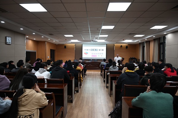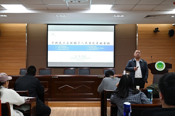 张震以自己攻读博士后的人生经历为引,以《牛奶与人类健康》为题,从“人类的营养需要”、“为什么我们需要牛奶”及“好奶源才能有好牛奶”三个方面向同学们介绍了牛奶对人类的重要性和产出好牛奶的必要条件;通过分析市面上的各类牛奶教会大家如何“花更少的钱喝到更好的牛奶”;并通过生动幽默的方式讲述奶牛场的智能装备与大数据,他寄语同学们在专业学习和研究上要“想做,更要努力做成”,努力为新时代人类健康做出自己的贡献。